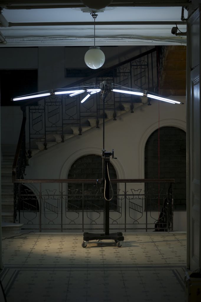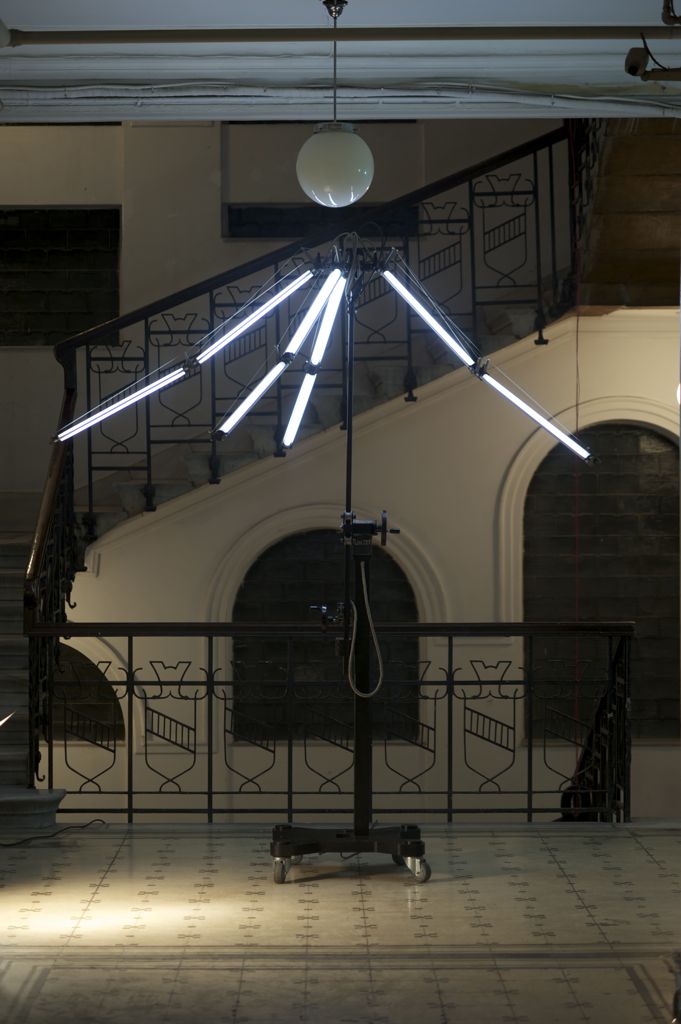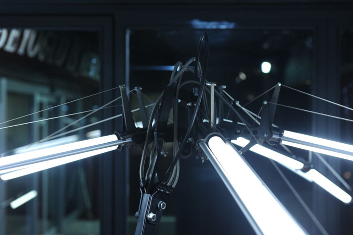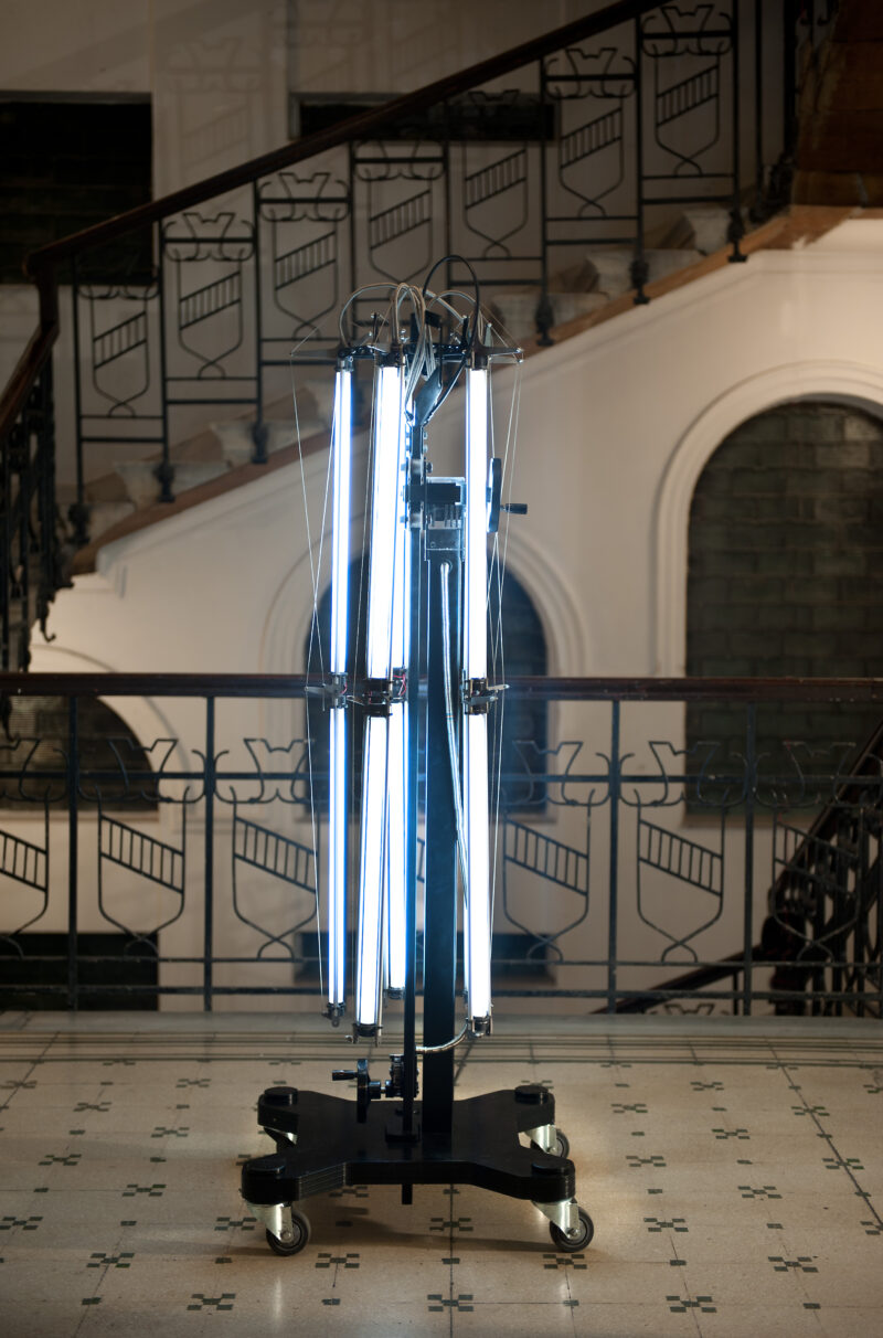 Built with fluorescent tubes and dimmable light, it merges motion and luminosity —
