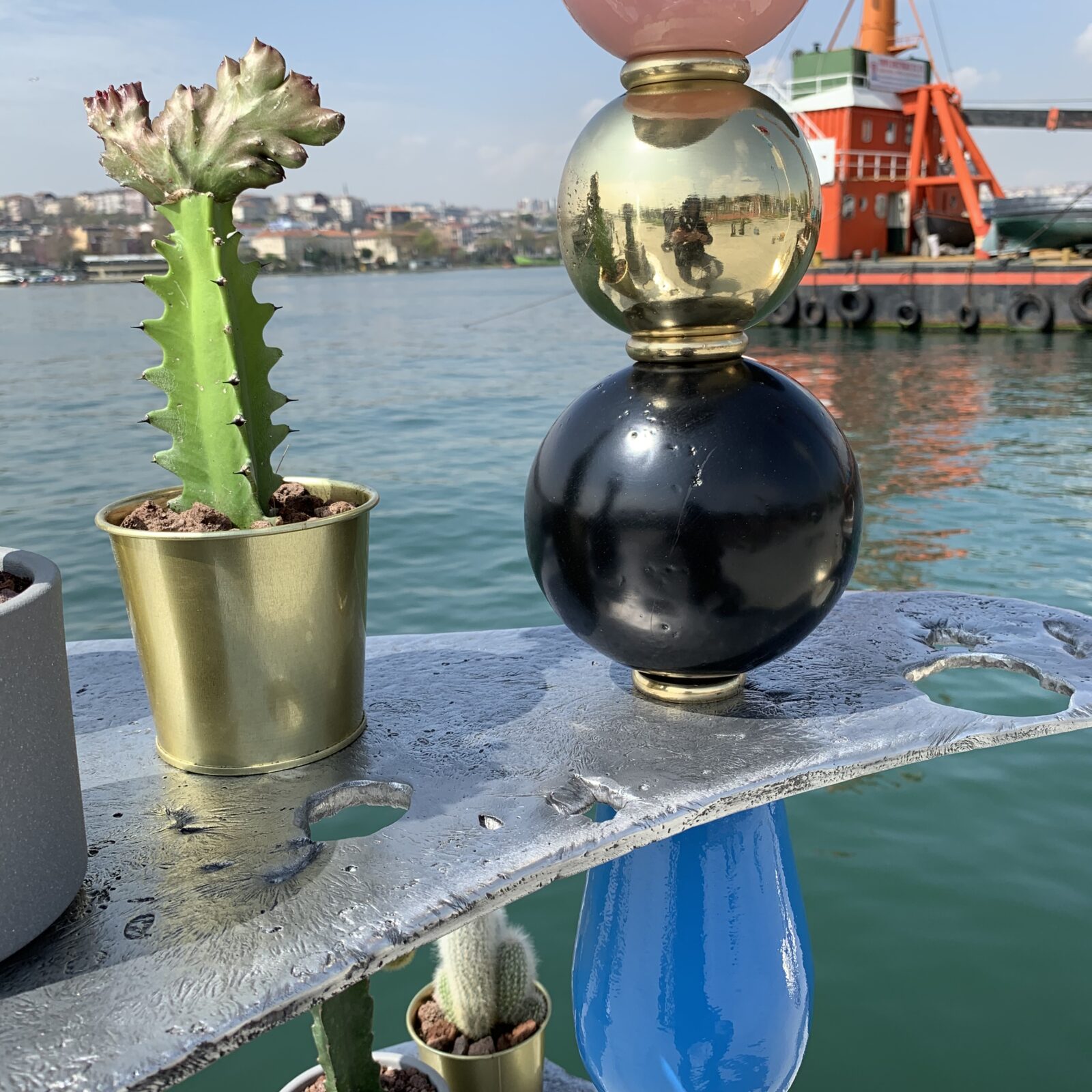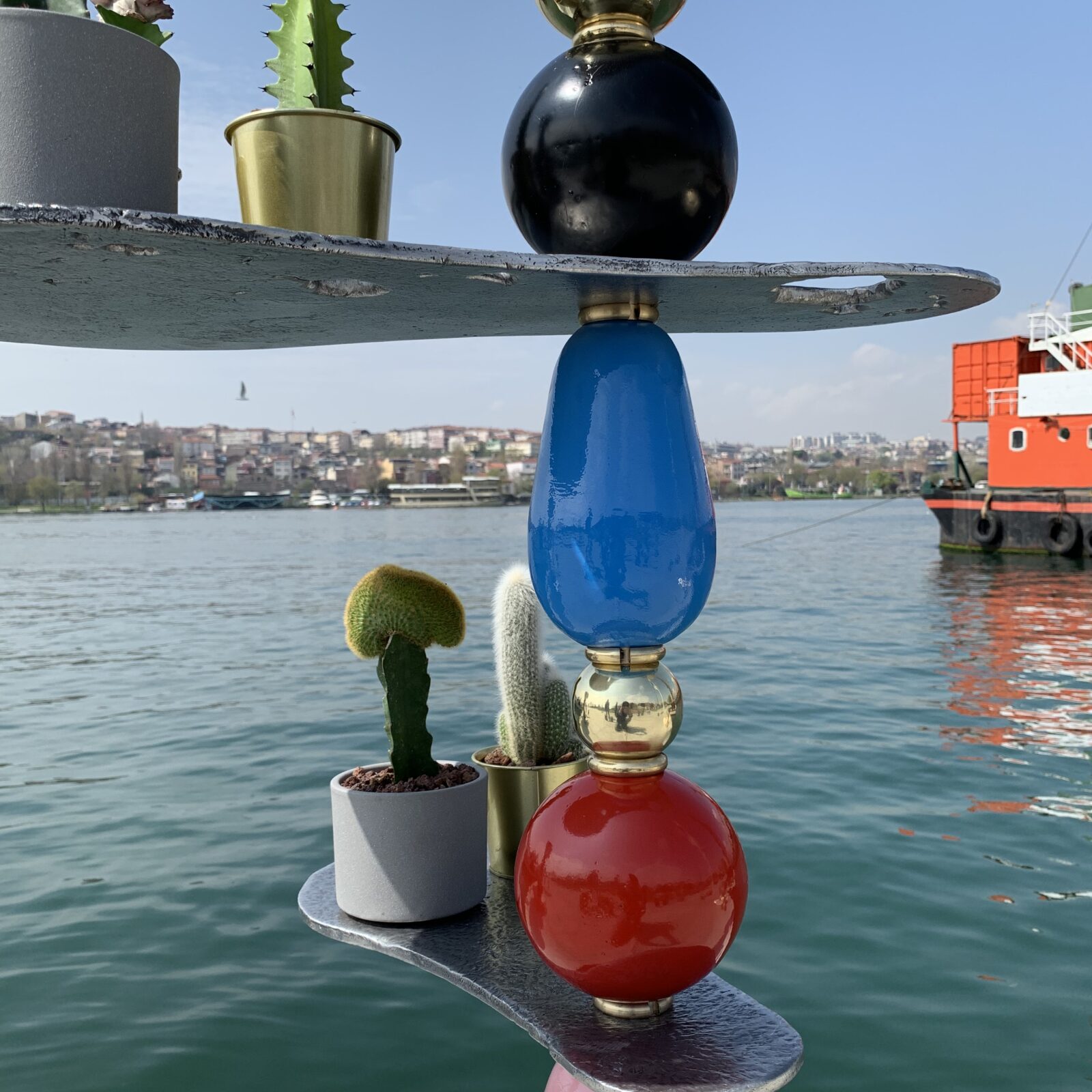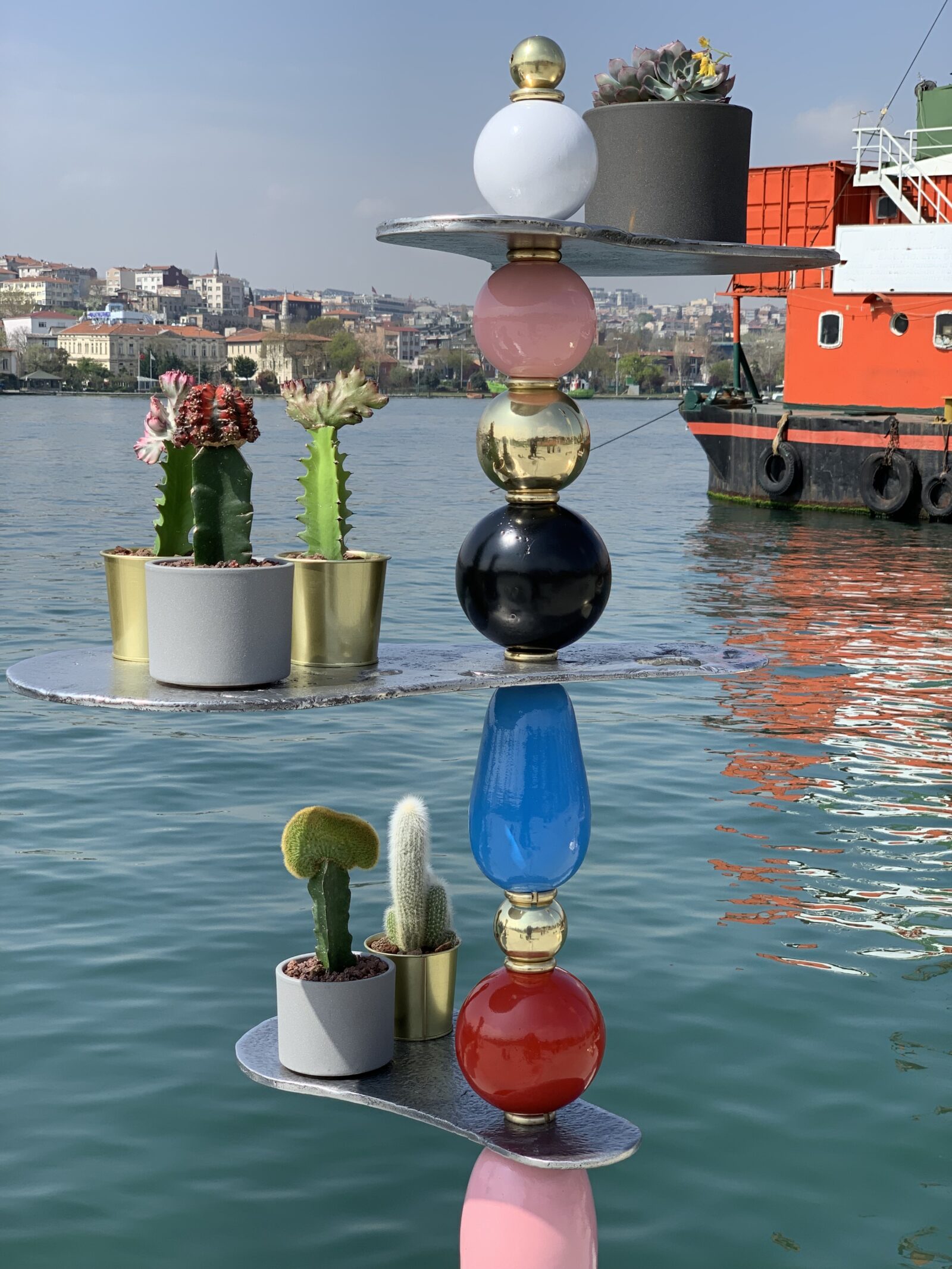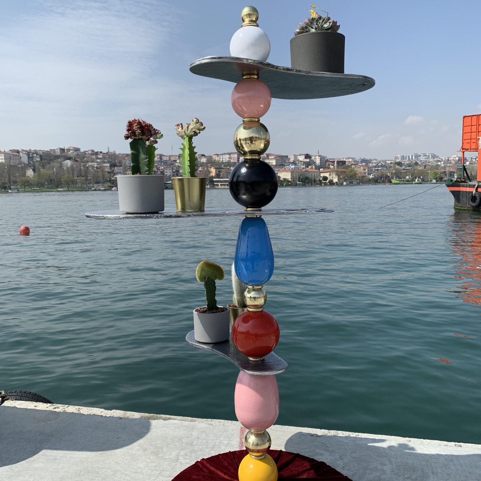 Each sphere — delicately formed in solid aluminum or brass — complements the adjustable shelving design, ensuring a solid and stable configuration.