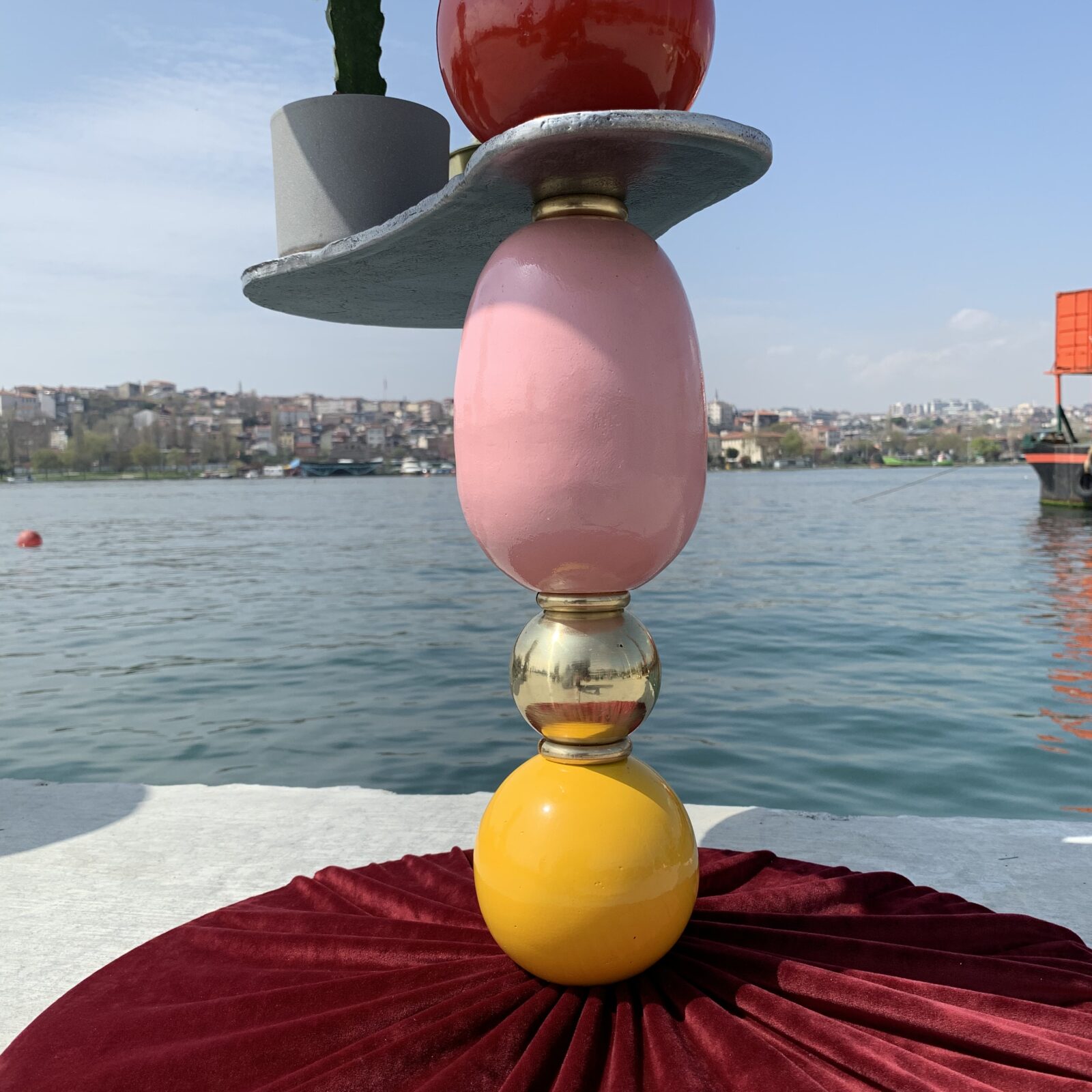 Adorned with stunning aluminum spheres in captivating tones, this elegant free-standing brass structure enchants instantly with its timeless charm.